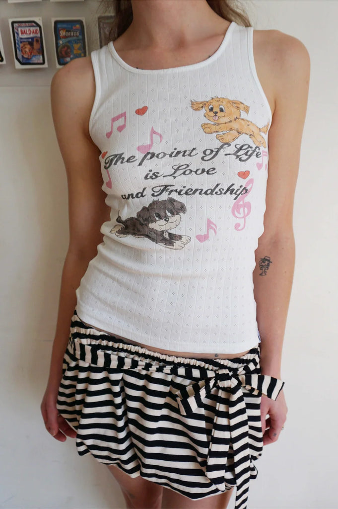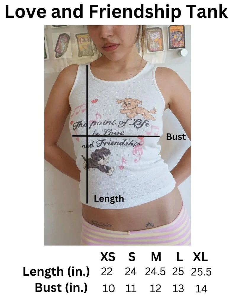 The Love and Friendship Tank is all about warmth, connection, and the kind of sweetness that feels like home. Featuring Blondita’s beloved pups — Ginger and Creature — this white pointelle tank captures the magic of love, loyalty, and everyday nostalgia.